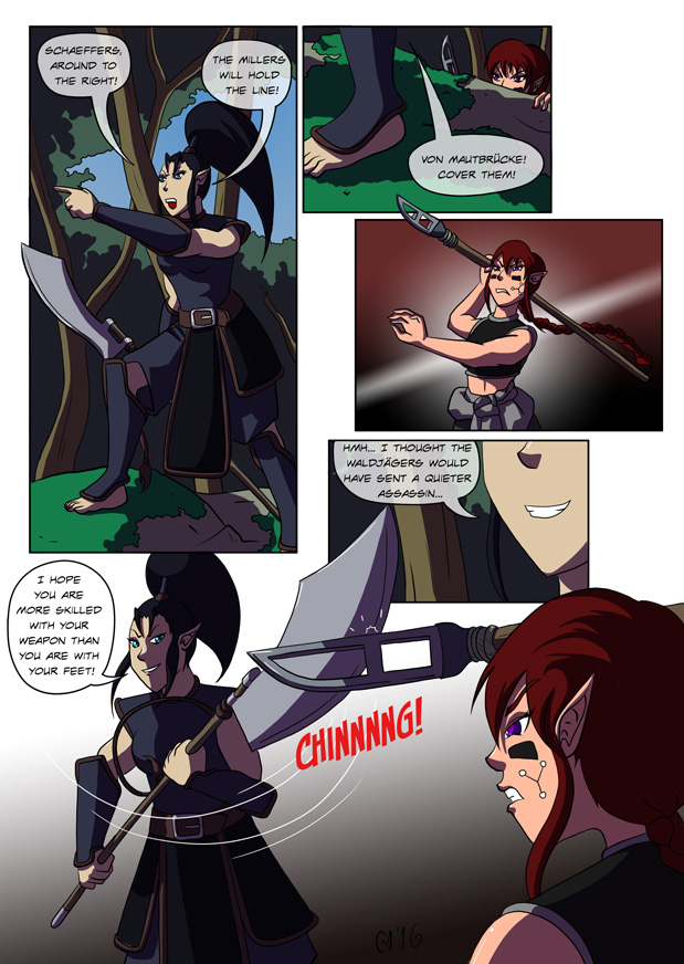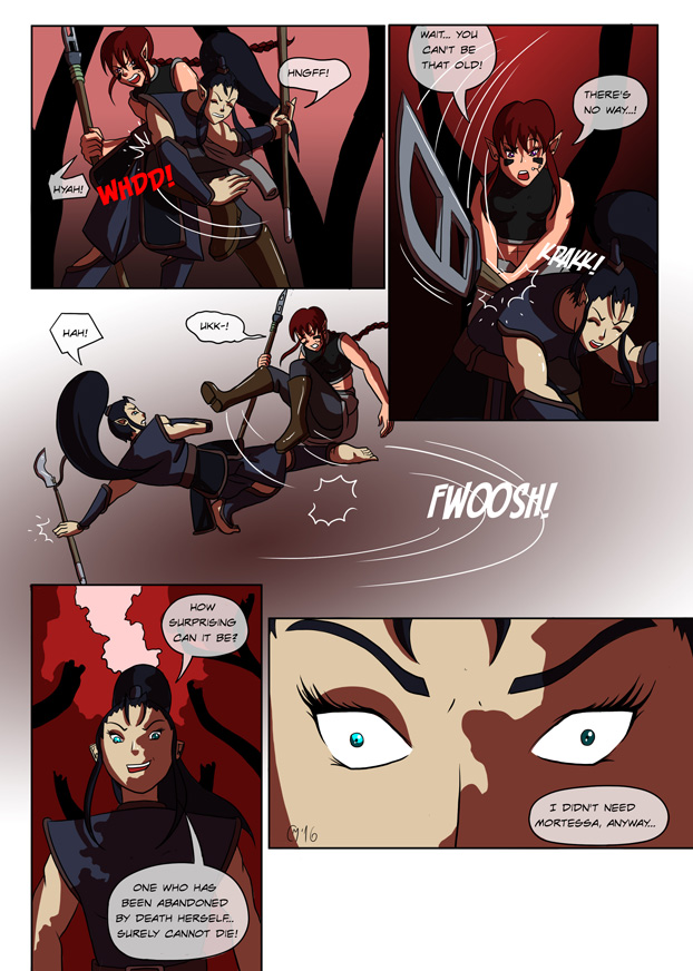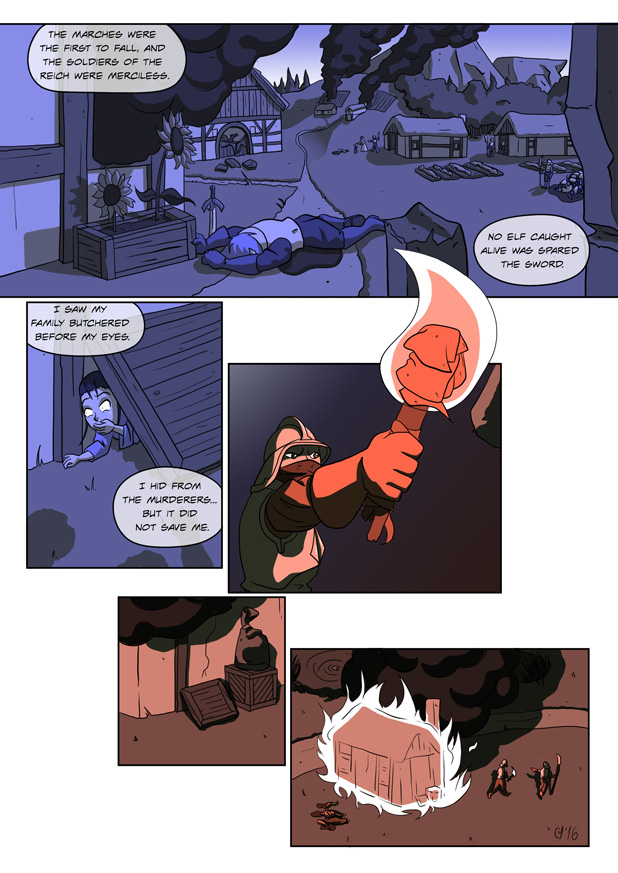 Point of Interest: This is the 600th page I’ve ever produced for Elf Blood. Quite a milestone! And how fitting that on this page, I’m experimenting with a new technique that I’ve been trying to figure out by studying various different comics. Although, of course, in Elf Blood, this is just being used as dressing to a flashback scene. I’m hoping to use this colouring style for a few other projects: